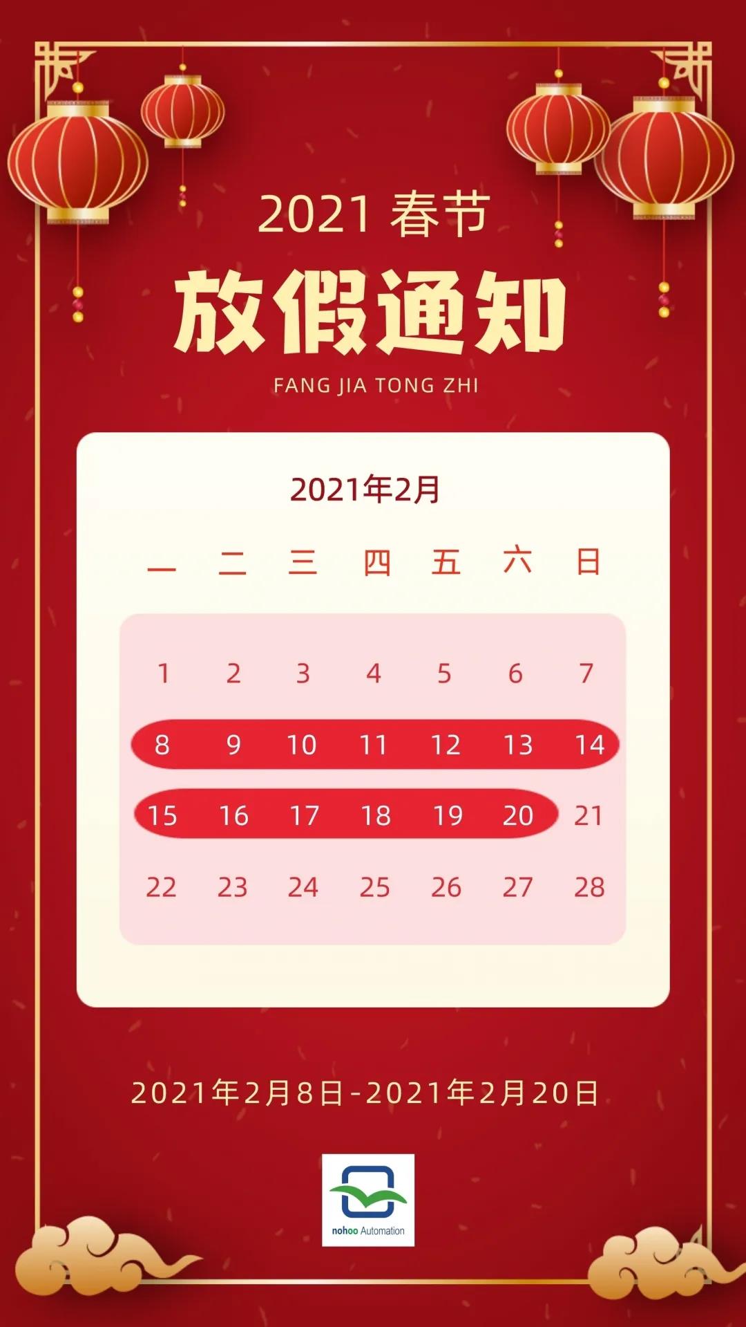 天天综合7799自動(dòng)化春節(jiē)放假時間為2月8日(農曆臘月二十七)至2月(yuè)20日(農曆正(zhèng)月初九),共13天。2月21日(農曆正月(yuè)初十)正常上班。