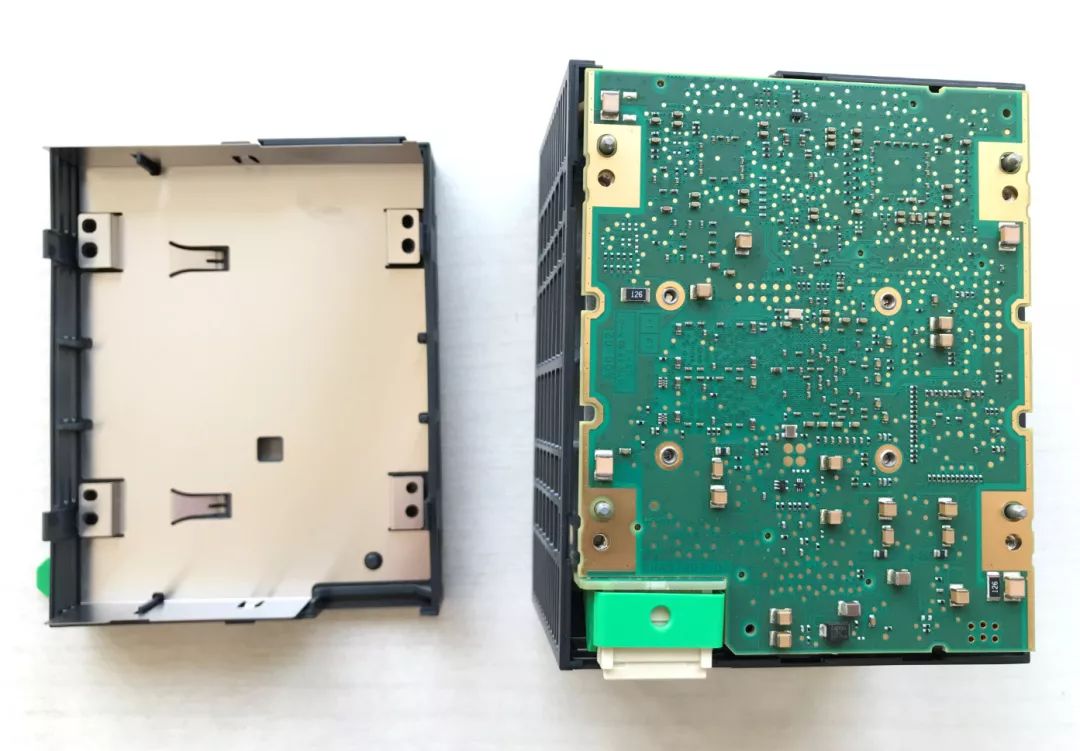 打開底(dǐ)蓋後,就(jiù)可以直(zhí)接取下上(shàng)蓋了。取下之後,可以看到PLC上麵和兩個側麵都同樣用一塊薄鋼板包著,這樣(yàng),除了用於散熱(rè)的兩(liǎng)個側麵外,PLC的4個麵都(dōu)有屏蔽EMI設計了(le)。