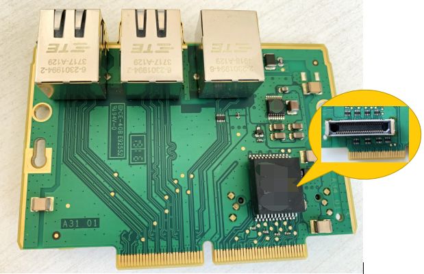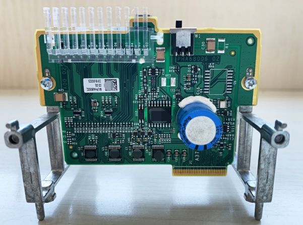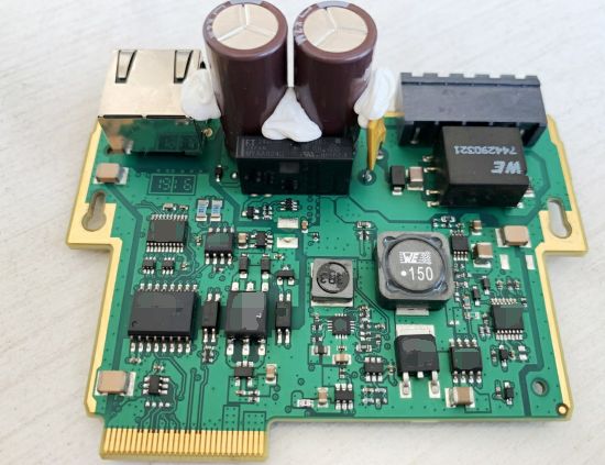 這是通信網絡的電路板,共有3個以太網口,其中最右邊的同時支持Sercos實時(shí)運動控製總(zǒng)線。在右小角還有一個黑(hēi)色的PULSE公司HX5008千(qiān)兆工業級網絡濾(lǜ)波器,在其背麵是一個千兆網絡擴展口(kǒu)。