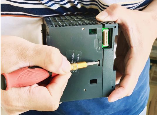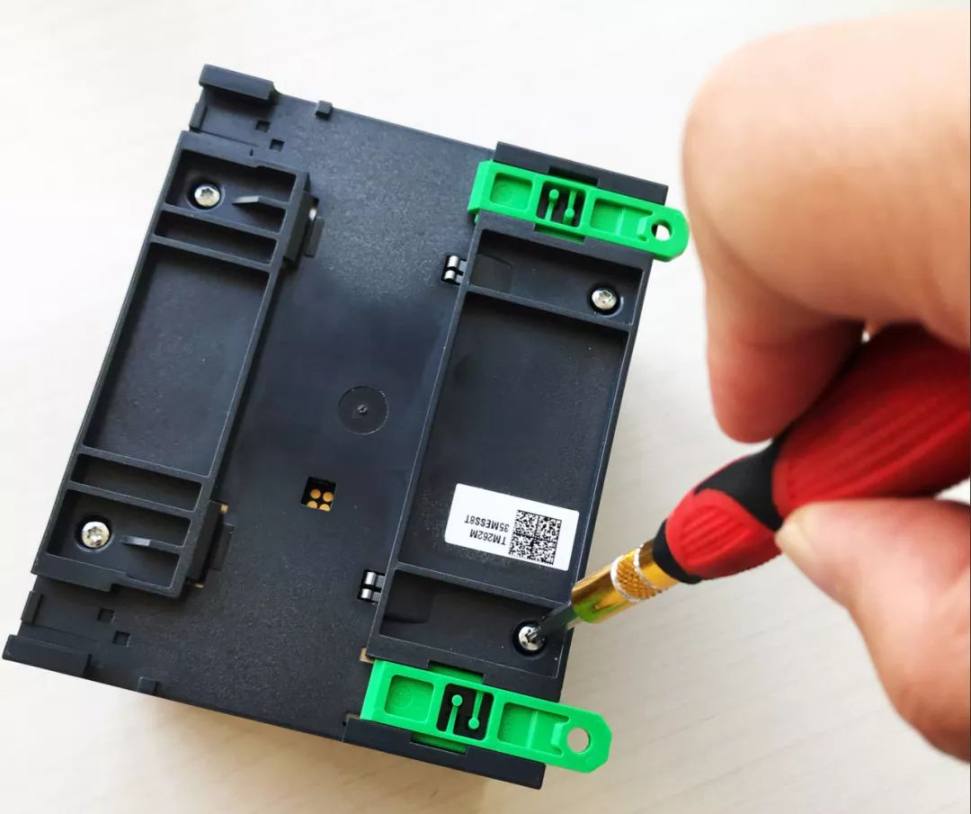 首先(xiān),我(wǒ)們把M262翻過來,可(kě)以看到底部(bù)有4個螺釘,不過是內六角的,常見的(de)一字和十字螺(luó)絲刀(dāo)無法擰開(kāi),這也可以避免一(yī)些人隨意打開PLC。我們用專門的內六角螺絲刀輕鬆(sōng)擰(nǐng)開了4個螺釘。