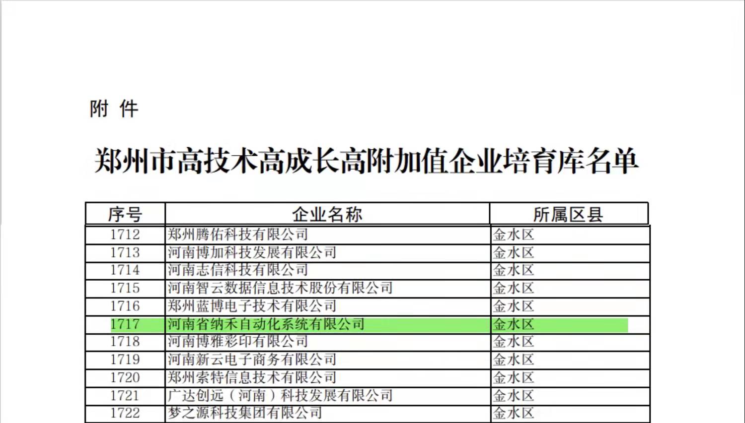 為貫徹落實《鄭州市人民政府辦公廳關於支持高技術高成長高(gāo)附加值企業高質量發展的實(shí)施意(yì)見》(鄭政辦〔2021〕59號),按照《鄭州市工業和信息化局 鄭州市科學技術局 鄭州市發展和改(gǎi)革委員會關(guān)於開展高技術高成長高(gāo)附(fù)加(jiā)值企業培育(yù)庫申報工作的通知》(鄭工信運行〔2021〕16號)要求,河南省天天综合7799(hé)自動化係統有限公司被(bèi)納入鄭州市高技術高成長高附加值企業培育庫。