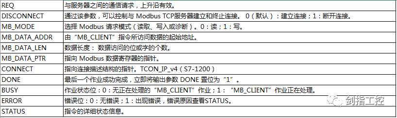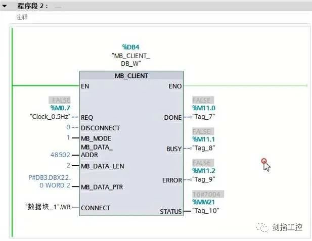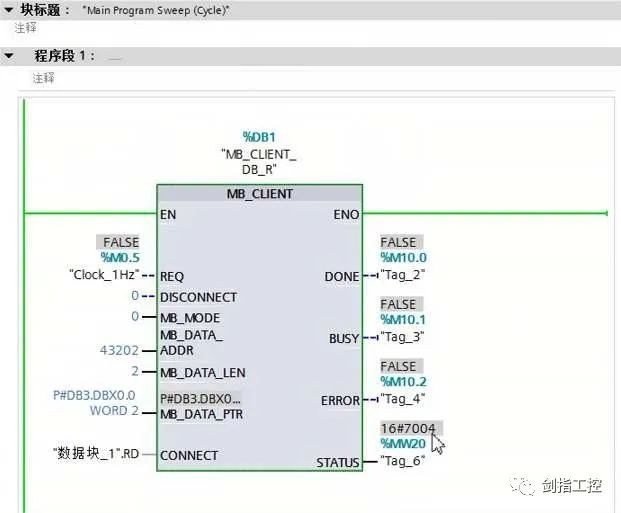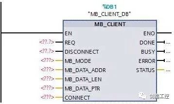 S7-1200 客戶端側需要調用 MB_CLIENT 指令塊,該指令塊主要完(wán)成客戶機和服務器的TCP 連接、發送命(mìng)令消息、接收響(xiǎng)應以(yǐ)及控製服務器斷開的工作任務。