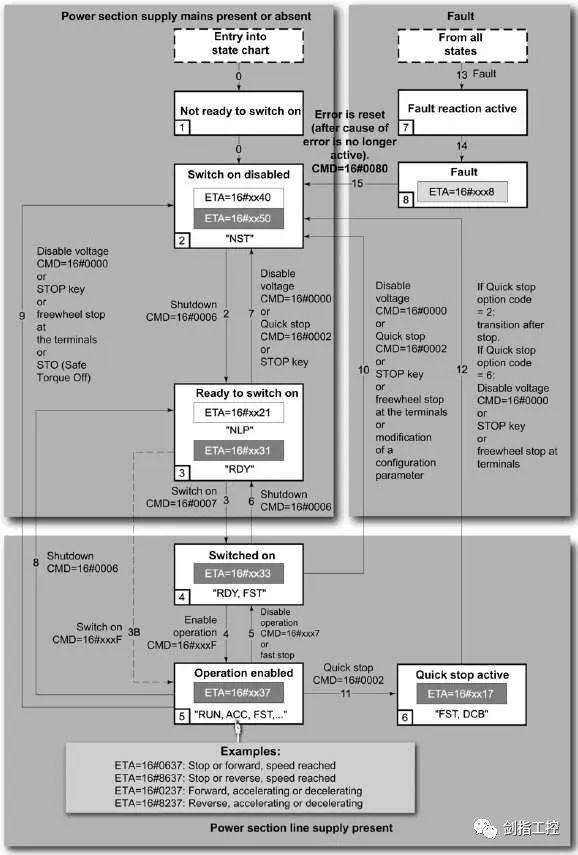 ATV340 變頻器采用 DriveCom 控製流程,通過(guò) ETA 狀(zhuàng)態字(通信(xìn)地址為 3201)讀取ATV340 的狀態,通過 RFR 輸(shū)出頻率字(通信地址為(wéi) 3202)讀取(qǔ) ATV340 的輸出頻率;通(tōng)過CMD 命令字(通信地址為 8501)控製 ATV340 的狀態轉換,通過 LFR 設(shè)定頻率字(zì)(通(tōng)信地址為 8502)寫入 ATV340 的設定頻率。