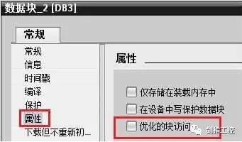 MB_DATA_PTR 指定的數據緩衝區可以(yǐ)為 DB 塊或 M 存儲(chǔ)區地址(zhǐ)中。DB 塊可以為優化的數據塊(kuài),也可以為(wéi)標準(zhǔn)的數據塊結構(gòu)。若為優化的數據塊結構,編程時需要以符號尋(xún)址的方式填寫該引腳;若為標(biāo)準的數據塊結(jié)構(可以右鍵單(dān)擊 DB 塊,“屬性”中將“優(yōu)化的塊訪問”前麵的勾去掉),需(xū)要以(yǐ)絕對地址的方式(shì)填寫(xiě)該引(yǐn)腳。本例以標準的數據塊(默認) 為例進(jìn)行編(biān)程。