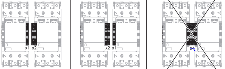 LC1G 接觸器最多可以安裝 4 個輔助觸點模塊,即最多可以實現 8 個觸點。接觸器左右 側各可以安裝 2 個模塊(自帶的 1NO+1NC 模(mó)塊已安裝於右側)。如(rú)果 2 個(gè)接觸器采用機 械(xiè)互鎖(suǒ),那麽(me)在(zài)兩個接觸器之間最多可以安裝 3 個輔助觸(chù)點模塊(kuài)(如下圖)。