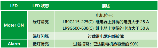 LR9G 熱過載繼電器上有 2 個 LED 燈,分別是 Alarm 警(jǐng)告指示燈和 Moter ON 電(diàn)機(jī)通(tōng) 電指示燈,請指示情況如下: